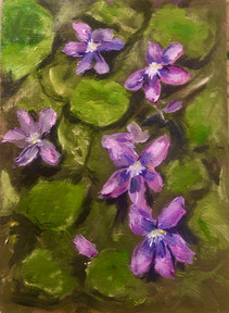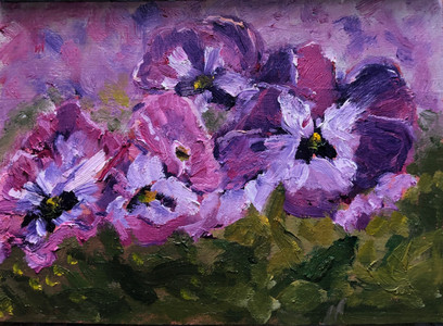 For me, whether it’s pottery, music or art, that feeling comes when I am able to find my center and become engrossed in the flow of the activity, no matter what it is. Centering that clay is much harder when you don’t feel centered yourself. So how do we make art in an atmosphere that is, at every turn, trying to make us crazy? How do we find that center? For me, first it was turning off the TV and getting out of the house for walks through my neighborhood. It was looking at flowers and trees beginning to bloom, bringing color back into the grey world that was winter. As I was walking, I began to really look at the little gifts that we see but take for granted every spring. Tiny violas blooming in someone’s lawn. Little white, yellow, red, blue, magenta, and purple flashes everywhere. I decided to begin taking close-up photos of those things I usually just observe with a smile and move on without looking really closely. As I started realizing the joy and peace those walks were bringing to me, I resolved to get back into the studio and make tiny paintings of the things that bring me joy. So I have a made about 20 paintings so far. I don’t have them all because my second decision was to start sending them to people like my niece and her husband, a nurse and doctor who are working on the front lines in one of their local hospitals.